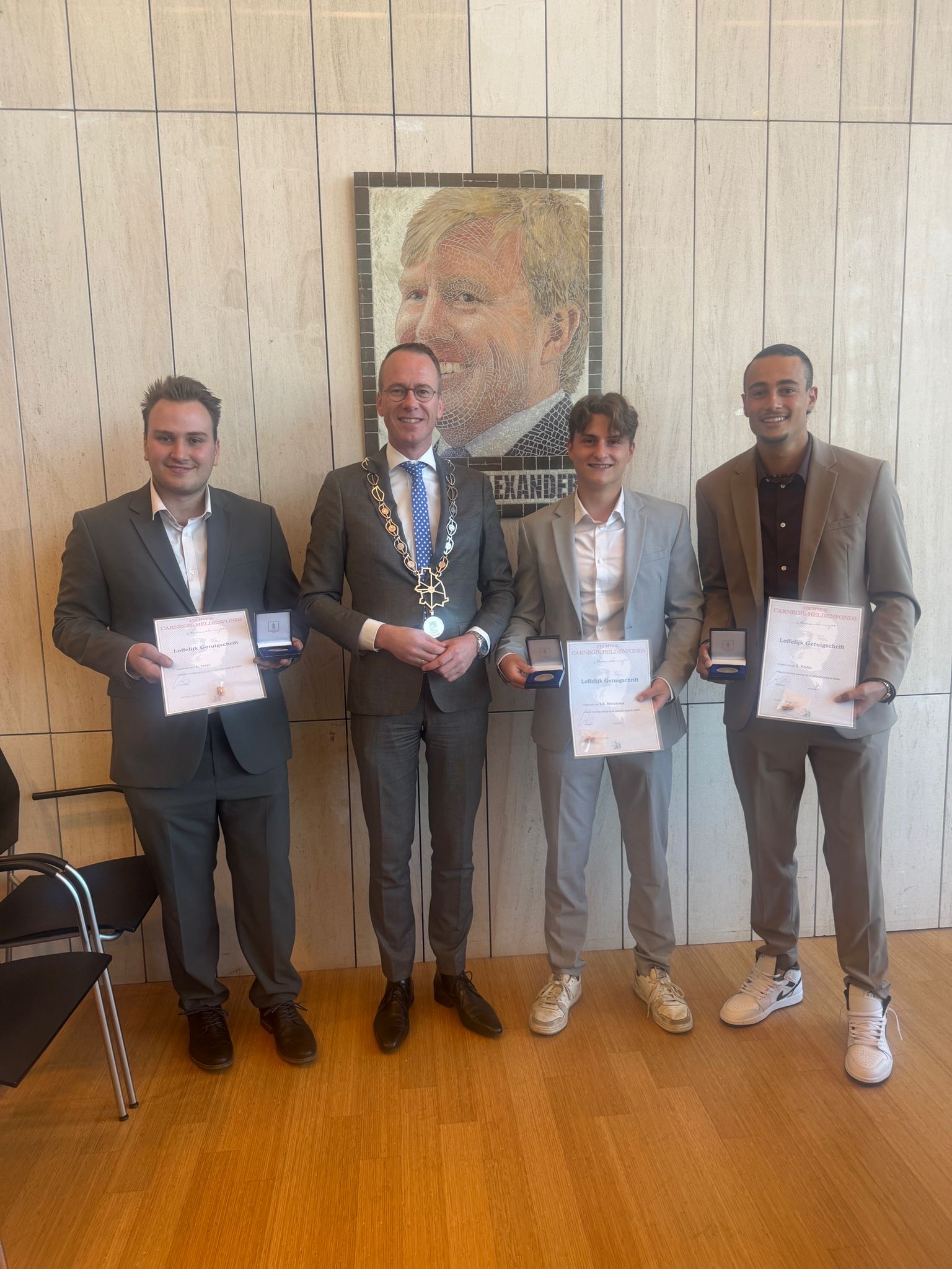 Burgemeester Van den Bos spreekt zijn grote waardering uit voor het moedige optreden van Liam, Liam en Silas: “Hun snelle en doortastende handelen heeft een mensenleven gered en laat zien wat ware burgerschap betekent. Het is een eer om hen namens de gemeente Goes en het Carnegie Heldenfonds te mogen onderscheiden.”